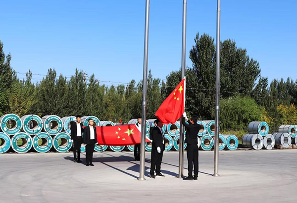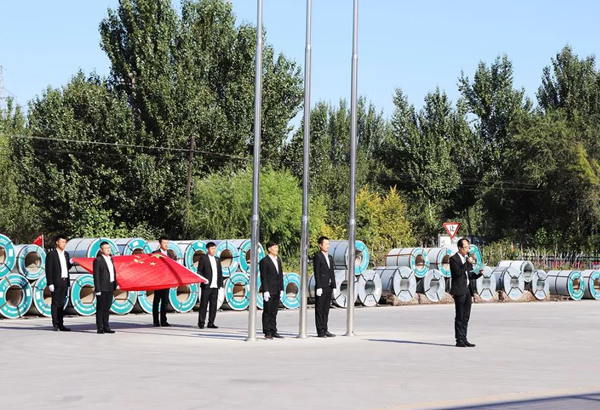 在薩大路辦公樓旗臺(tái)前,全體職工整齊列隊(duì),莊嚴(yán)肅穆,當(dāng)身姿矯健的護(hù)旗手邁著整齊的步伐,護(hù)送著國(guó)旗來(lái)到旗桿下。隨著一聲號(hào)令,在雄壯的國(guó)歌聲中,鮮艷的五星紅旗冉冉升起,現(xiàn)場(chǎng)全體人員昂首挺胸,用行注目禮的方式表達(dá)了黨的無(wú)限忠誠(chéng)和*誠(chéng)摯的祝福。升旗儀式結(jié)束后,總經(jīng)辦王主任發(fā)表了講話,向奮戰(zhàn)在公司各個(gè)崗位上的干部職工致以節(jié)日的問(wèn)候,邁入金秋十月,進(jìn)入四季度,又到了全年目標(biāo)攻堅(jiān)奮戰(zhàn)之時(shí),我們要再接再厲,勇于擔(dān)當(dāng),不懈怠,努力工作,擼起袖子加油干,全力以赴打好四季度**一仗,為公司**完成全年生產(chǎn)經(jīng)營(yíng)任務(wù)目標(biāo)共同努力奮斗!